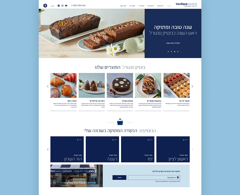 האתגר המרכזי היה לייצר חוויית גלישה שתשקף את העושר הקולינרי של המותג, תוך הנגשה ברורה של מגוון המוצרים בכל סניף ומתן אפשרות ליצור קשר להזמנות, גם ללא מערכת מכירה אונליין. לצד זאת, נדרשנו להציג רשת מתרחבת עם עשרות סניפים ברחבי הארץ, באופן שמאפשר למשתמש למצוא את הבוטיק הקרוב במהירות, בצורה נוחה ואינטואיטיבית.